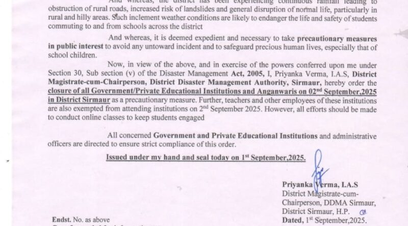 शिमला और सिरमौर में 2 सितंबर को सभी शिक्षण संस्थान रहेंगे बंद