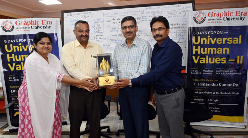 ग्राफिक एरा डीम्ड यूनिवर्सिटी के के.पी. नौटियाल भवन में आयोजित पांच दिवसीय एफडीपी के आखिरी दिन बतौर मुख्य अतिथि प्रो-वी.सी. डा.संतोष एस.सर्राफ ने कार्यक्रम को संबोधित करते हुए कहा कि खुशियां बांटना और सभी के जीवन में सकारात्मकता लाना ही सच्चे अर्थों में शिक्षा का उद्देश्य है। हम मानवीय मूल्यों की रोशनी समाज के हर कोने तक फैलाएंगे।